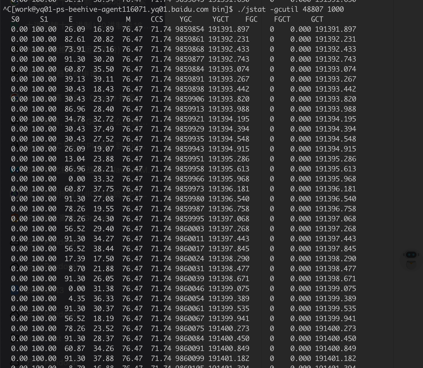 异常实例的 kafka-request-handler-x 的 CPU 使用量相较于两个正常实例是较高的,这也证实了可能存在异常请求。再执行 jstat 看一下 JVM gc 的指标