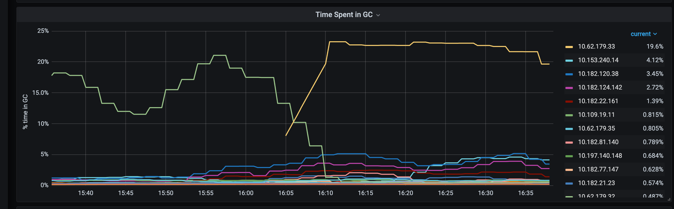 本周(2024/08/12)开始陆续出现 kafka build 集群监控采集超时的问题。从监控上可以看出,和其他实例相比,有一个实例的 CPU 使用量很高(12 vs 4 / 核),并且 GC 的时间特别长(25% vs 2%),并且即使这个问题实例 A 做了迁移,实例 B 又接着出问题,每次一个实例。初步可以判断,大概率是由外部请求导致的问题。