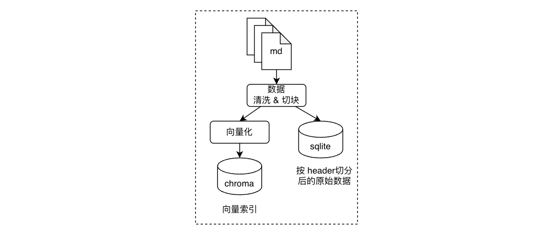简单来说,就是将原始文档转换为 markdown 的形式,并按照一定的规则进行第一次切块,切块后的原始数据存入到 sqlite 中。接着进行更细粒度的切块,并将切块结果向量化后,存入 chroma 向量数据库中。