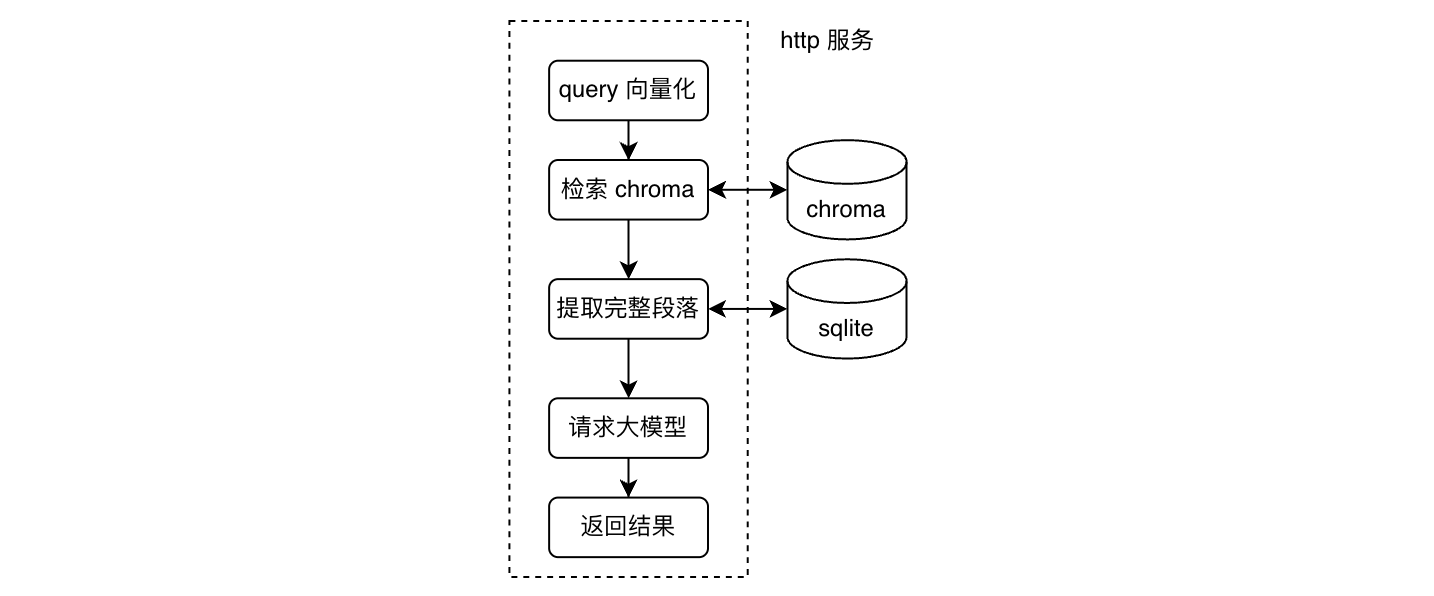 为了尽快实现一版可用的简易 rag 服务,目前采用的是数据全量更新的方式,也即参考批量库的建库流程,每次都生成全量的数据(批量建库),然后通知(传库) rag query 服务切换数据地址(换库)。当前因为基本没有人使用,所以就是简单的先停 query 服务,然后更新 chroma 和 sqlite 数据,最后启动 query 服务。