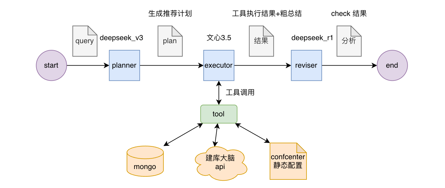 在对接建库大脑时,将它提供的一些 http 接口封装为了 tool 供大模型在回答问题时进行工具调用。第一版的实现借鉴了 eino 的 plan - exec 执行流程,介绍文章见 DeepSeek + Function Call:基于 Eino 的“计划——执行”多智能体范式实战,流程如下