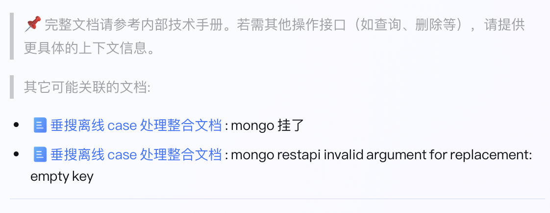 目前由于模型对于发给它的上下文的总结并不是特别准确,所以在最终返回给用户的结果中,也会加上首位的结果,以及 topk 的原始文档链接及其中的标题,大概格式如下