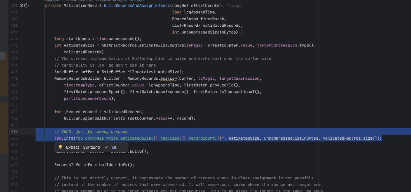 privateValidationResult buildRecordsAndAssignOffsets(LongRef offsetCounter, long logAppendTime, RecordBatch firstBatch, List<Record> validatedRecords, int uncompressedSizeInBytes) { long startNanos = time.nanoseconds(); int estimatedSize = AbstractRecords.estimateSizeInBytes(toMagic, offsetCounter.value, targetCompression.type(), validatedRecords); // The current implementation of BufferSupplier is naive and works best when the buffer size // cardinality is low, so don't use it here ByteBuffer buffer = ByteBuffer.allocate(estimatedSize); MemoryRecordsBuilder builder = MemoryRecords.builder(buffer, toMagic, targetCompression, timestampType, offsetCounter.value, logAppendTime, firstBatch.producerId(), firstBatch.producerEpoch(), firstBatch.baseSequence(), firstBatch.isTransactional(), partitionLeaderEpoch);